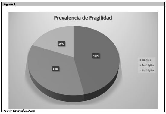 Según el cuestionario FRAIL, el 46,6 % de los pacientes fueron clasificados como frágiles (n=187), el 34,4 % como prefrágiles (n=138) y el 19,0 % como no frágiles (n=76) (Figura 1). La media del índice FRAIL fue de 2,22 (DT ± 1,55).