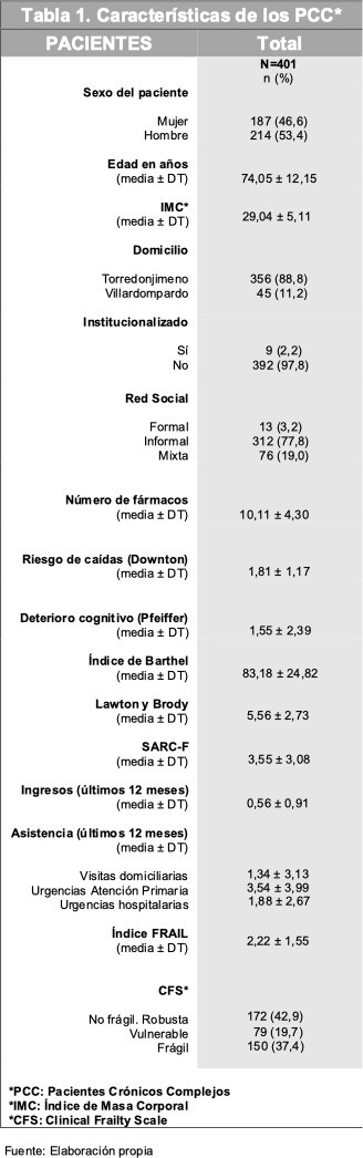 En primer lugar, haciendo referencia al análisis descriptivo del estudio (Tabla 1), se incluyeron un total de 401 pacientes crónicos complejos, con una media de edad de 74,05 años (DT ± 12,15), siendo hombres el 53,4 % (n=214). La mayoría residía en Torredonjimeno (88,8 %) frente a Villardompardo (11,2 %), y el 97,8% no se encontraba institucionalizado.