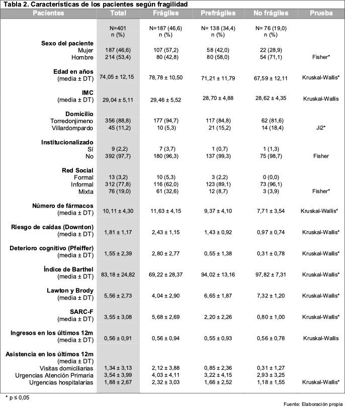 Desde el punto de vista funcional, los pacientes frágiles mostraron menores puntuaciones en el índice de Barthel, 69,22 (DT ± 28,37) y en la escala de Lawton y Brody, 4,04 (DT ± 2,90). Además, los frágiles requirieron más visitas domiciliarias, 2,12 (DT ± 3,88) y acudieron con mayor frecuencia a urgencias, tanto de Atención Primaria, 4,03 (DT ± 4,11) como hospitalarias, 2,32 (DT ± 3,03).