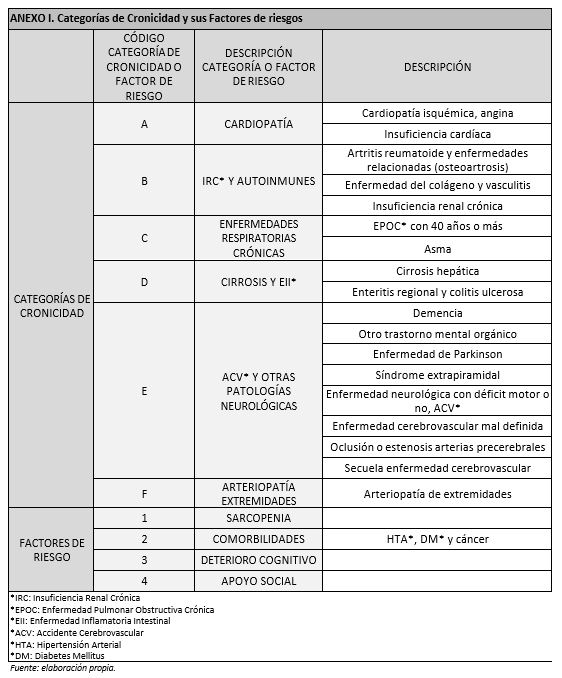 Se consideró paciente crónico complejo a aquel que presentaba al menos dos patologías incluidas en el Anexo 1 o una de estas patologías asociada a algún factor de riesgo (13,14). El tamaño de muestra calculado, 385 pacientes, fue asumiendo que la proporción de fragilidad era del 50 % (precisión 5 % en la estimación de una proporción mediante un intervalo de confianza asintótico Normal al 95 % bilateral) (9). Finalmente se incluyeron a 401 pacientes con las características indicadas.