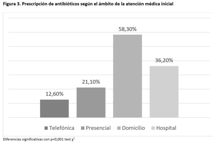 Otro factor determinante a la hora de establecer un mayor consumo de antibióticos fue el lugar del primer contacto sanitario (23) (15). La Atención Primaria destacó por una menor prescripción respecto a los puntos de urgencia hospitalaria donde la prescripción y el mayor número de pruebas complementarias solicitadas fueron más frecuentes (24) en parte debido por el mayor acceso a las mismas y por otro lado la gravedad de la sintomatología que presentaban los pacientes, siendo la fiebre y la disnea los síntomas mayormente asociados a un mayor uso de antibióticos. En Atención Primaria el uso de antibióticos fue más frecuentes en pacientes que recibieron asistencia en domicilio, también debido al perfil de vulnerabilidad de esos pacientes (25). Además, la atención en centros de salud estuvo caracterizada por un exhaustivo seguimiento telefónico, útil para valorar la evolución clínica de la COVID-19 y tomar decisiones sobre la actitud diagnóstica y terapéutica (26). Esta nueva forma de gestión sanitaria pudo favorecer un mayor uso de la antibioterapia, sobre todo en la primera ola de pandemia (24). Tras la pandemia, se ha comprobado que la capacidad del médico de familia para resolver las demandas planteadas por teléfono es elevada, y sigue estando relacionada con la presencia de enfermedades crónicas y el conocimiento previo entre paciente y médico (27).