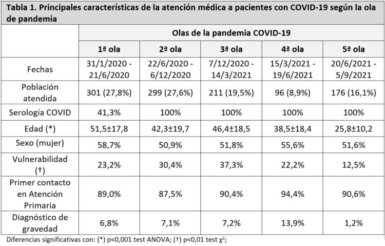Se auditaron un total de 1083 pacientes con síntomas de COVID-19. Las principales características de la atención médica dispensada a estas personas se exponen en la tabla 1. La media de edad media fue de 45 años (±19,4), superior en las primeras olas de pandemia (p<0,001 ANOVA), con igual proporción de sexos (mujeres 55%, hombres 45%). La cuarta parte de las personas atendidas fueron consideradas vulnerables, siendo más frecuentes en la segunda y tercera ola (p<0,01 test χ2). El 89,4% de los pacientes consultaron de forma inicial en el ámbito de la Atención Primaria (telefónico 57,9%, presencial 29,3% y domicilio 2,2%). El diagnóstico de gravedad por criterios clínicos fue del 6,9%, con diferencias nos significativas entre olas de pandemia.