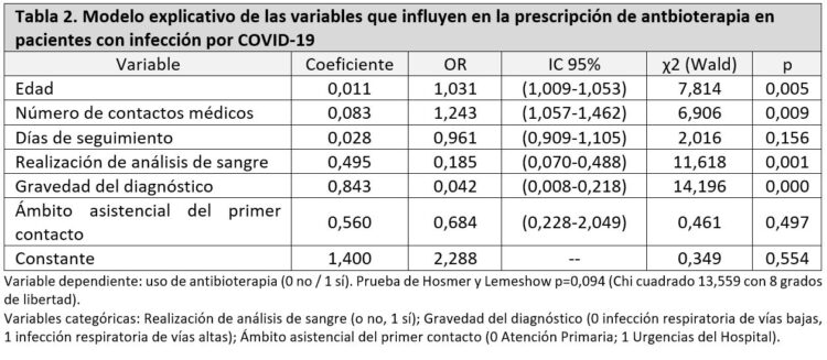 La tabla 2 ofrece el modelo explicativo de las variables que influyen en la prescripción de antibioterapia tras realizar el análisis multivariante. Las variables de sexo, ámbito inicial de atención médica, número de síntomas y duración del seguimiento no influyeron en la indicación médica para el uso de antibioterapia. Si se encontró relación con una mayor edad de la persona contagiada (OR=1,03) y un mayor número de contactos del enfermo con los servicios médicos (OR=1,24). La no realización de pruebas complementarias como el análisis de sangre o la menor gravedad del diagnóstico, por ser una infección de vías respiratorias bajas, se relacionó con una menor prescripción de antibioterapia (OR= 0,185 y OR=0,042, respectivamente).