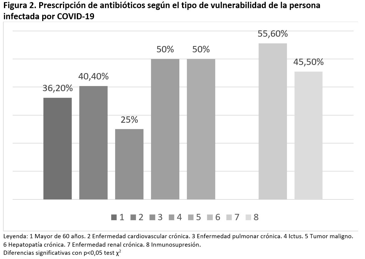 Resultados: 1083 pacientes con edad media 45±19,4 años y 55% mujeres, 25% fueron vulnerables. 89,4% consultaron de forma inicial en Atención Primaria (telefónico 57,9%, presencial 29,3% y domicilio 2,2%), el 6,9% presentaron criterios clínicos de gravedad. 18,6% tomaron antibióticos: azitromicina (10,2%), cefditoreno (8,7%), amoxiclavulánico (5,1%), levofloxacino (2,2%) y amoxicilina (1,3%). Un 56,9% tomaron 1 antibiótico, el 40,2% dos antibióticos diferentes y un 2,9% ≥3 antibióticos. Mayormente fueron prescritos en las dos primeras olas (p=0,032 test χ2). El modelo multivariante final encontró relación entre la prescripción de antibioterapia con la edad (OR [1,01-1,05]) y el número de contactos del enfermo con los servicios médicos (OR 1,06-1,46). Por el contrario, el no realizar pruebas complementarias (OR 0,07-0,49) y el diagnóstico de infección respiratoria de vías altas (0,008-0,218) se relacionaron con menor uso de antibióticos.