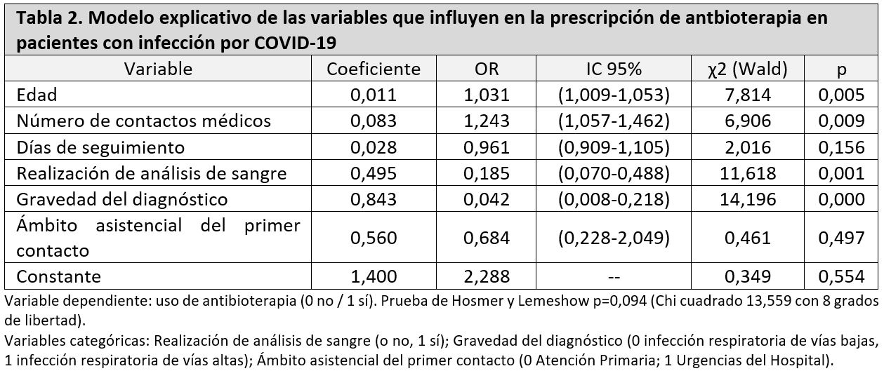 La tabla 2 ofrece el modelo explicativo de las variables que influyen en la prescripción de antibioterapia tras realizar el análisis multivariante. Las variables de sexo, ámbito inicial de atención médica, número de síntomas y duración del seguimiento no influyeron en la indicación médica para el uso de antibioterapia. Si se encontró relación con una mayor edad de la persona contagiada (OR=1,03) y un mayor número de contactos del enfermo con los servicios médicos (OR=1,24). La no realización de pruebas complementarias como el análisis de sangre o la menor gravedad del diagnóstico, por ser una infección de vías respiratorias bajas, se relacionó con una menor prescripción de antibioterapia (OR= 0,185 y OR=0,042, respectivamente).